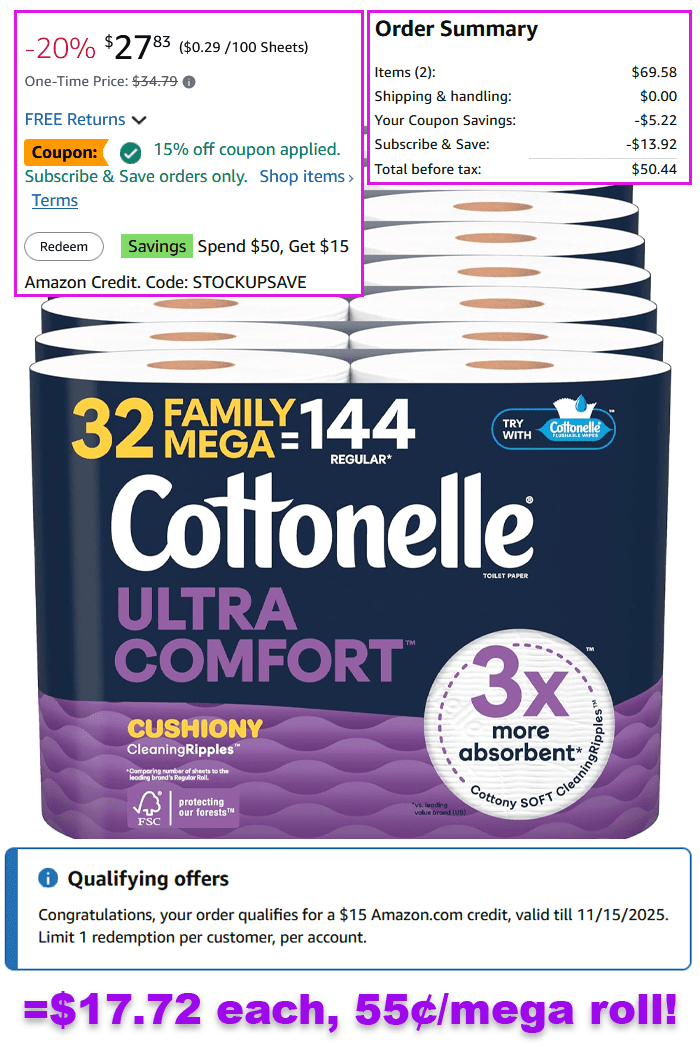 - That’s like paying as low as $35.44 for 2 packs, or $17.72 each, which is as low as 55¢/mega roll!