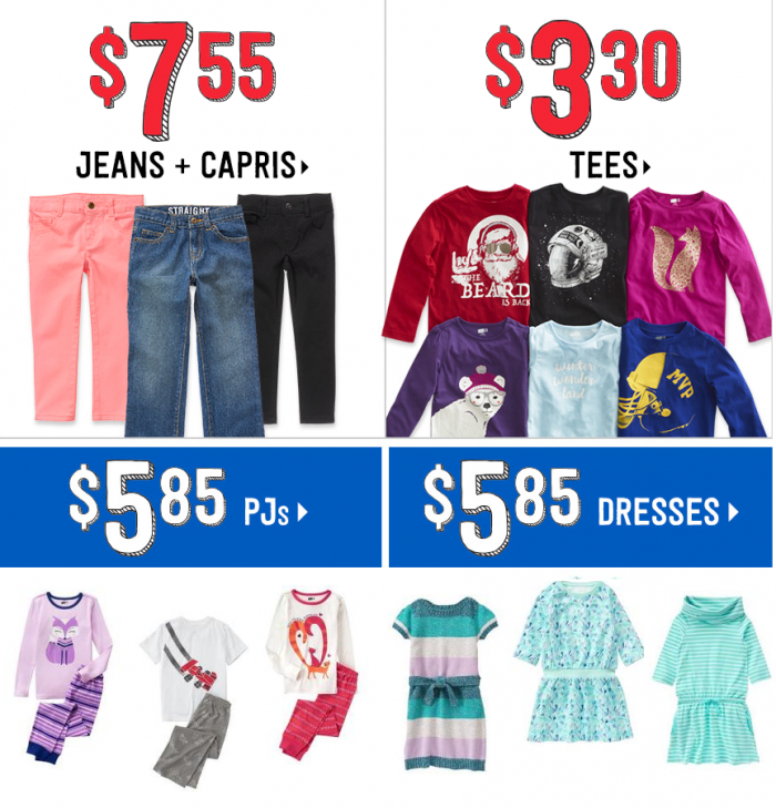 There are cute dresses and pajamas at $6.88, only $5.85 after the code! You can also get Jeans & Capris as low as $7.55, and Graphic Tees from $3.30!
