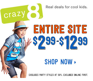 Today Only, Crazy 8 is offering FREE shipping with code SPRINGSHIP! Plus, the entire Crazy 8 site is just $12.99 and under. I just LOVE free shipping! Even if you only find one item you want, it is fine. You still get free shipping! This is a great way to grab those one or two items that your kiddo needs.