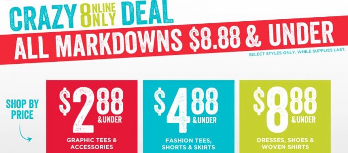 Don’t miss this hot one day sale at Crazy 8, where all markdowns are $8.88 and under! Stock up on clothes for school and next summer! You could easily score a head-to-toe outfit for less than $10, including shoes!