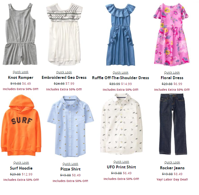 Find super cute Knot Rompers for girls for $6.49 (regularly $19.88), a wide variety of dresses and tops for both boys and girls, and even jeans!