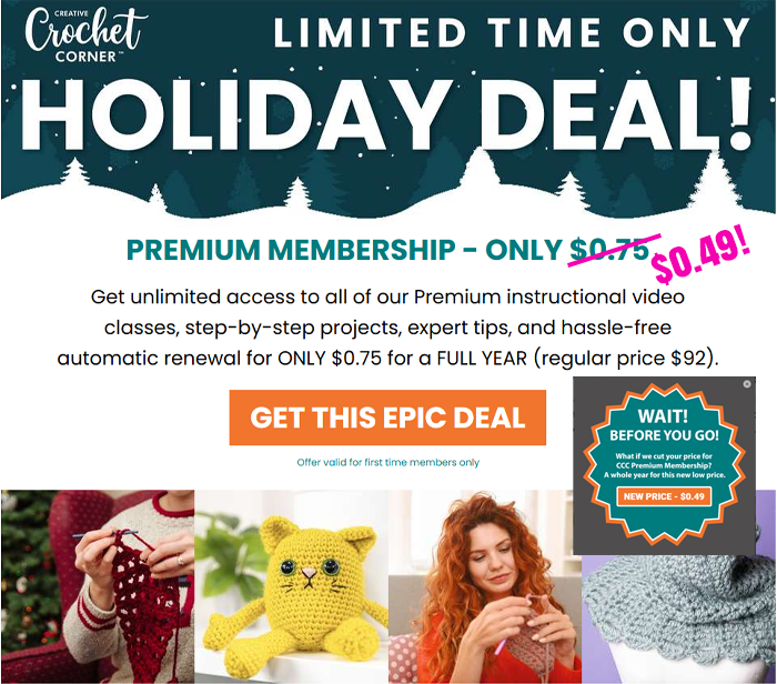 For a limited time, you can grab a FULL year of Premium Membership to Creative Crochet Corner for just $0.75 — and if you stay on the page for a few seconds, the price drops all the way down to $0.49!