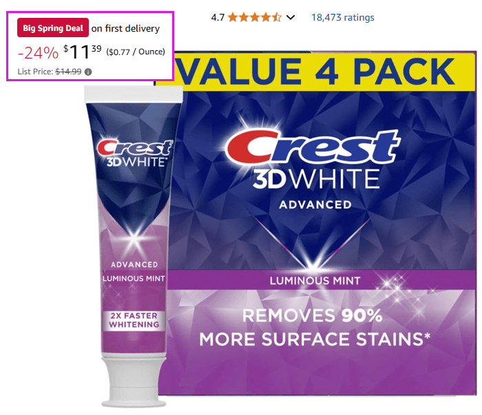 Crest 3D White Advanced Luminous Mint Teeth Whitening Toothpaste, 3.7 oz Pack of 4 for $11.99 (Reg $14.99)