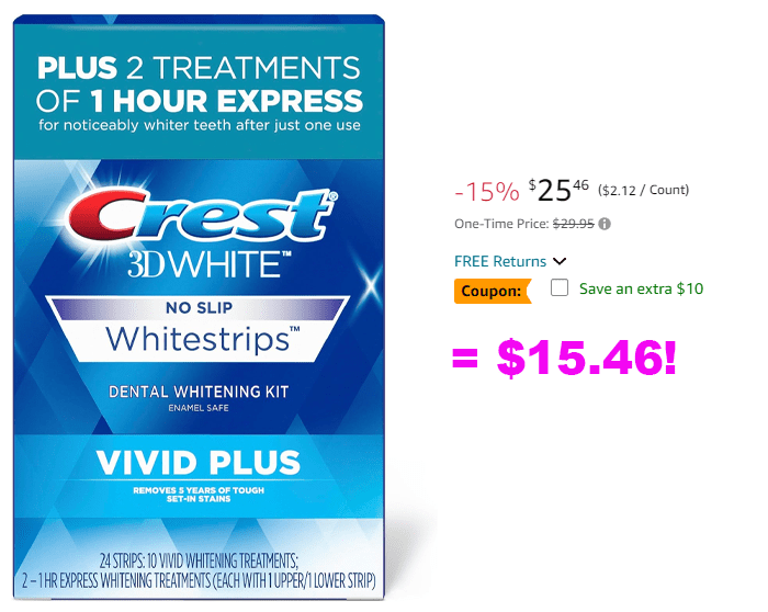 Crest 3DWhitestrips Vivid Plus 10 Treatments + 1 Hour Express 2 Treatments Teeth Whitening Kit for $25.46 (Reg $29.95)!