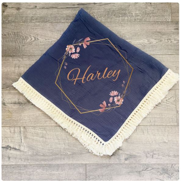 Customize these soft muslin blankets with a floral design and name. These are beautiful and would make a thoughtful gift.