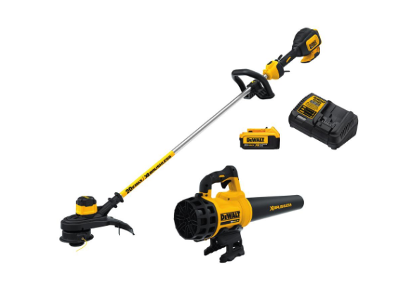 This 20-Volt Max String Trimmer kit is a value-filled combo to tackle your outdoor projects. This bundle includes a string trimmer, blower and extra battery pack. The DEWALT 20-Volt Max Brushless String Trimmer (DCST920P1) provides precise power control with a variable speed trigger as well as performance and run time management with the High/Low speed control switch. The patented gear drive design provides more torque and maintains cut speed under load, while the dual-line, bump feed head clears a full 13 in. Well balanced and weighing only 8.5 lbs., the string trimmer is easy to maneuver, reducing stress on the user.
