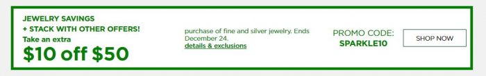- SPARKLE10 – Take an extra $10 off $50 purchase of fine and silver jewelry. Ends December 24.