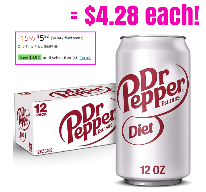 Diet Dr Pepper Soda, 12 fl oz cans, 12 pack for $6.97