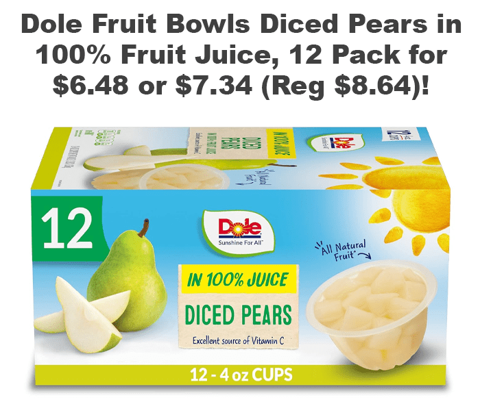 Dole Fruit Bowls Diced Pears in 100% Fruit Juice, 12 Pack for $8.64