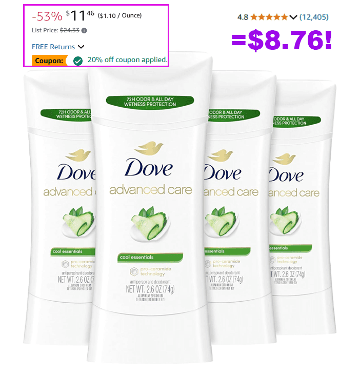 Dove Advanced Care Antiperspirant Deodorant Stick Cool Essentials, 4 Ct for $13.48 (Reg $24.33)