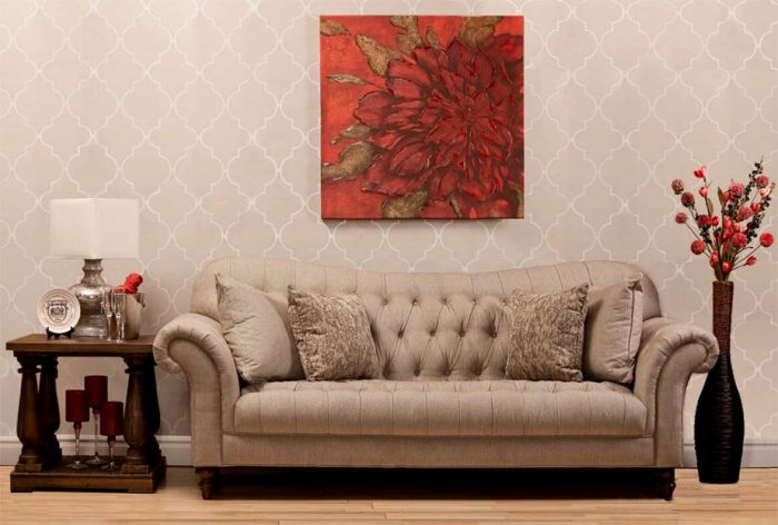 The DownEast Victoria Button-Tufted Sofa in herringbone pattern fabric is now ‘back’ given popular demand! Retailing for $799.99, it is also available in a loveseat, chair and ottoman. Solid hardwood frame with plywood for strength and great shaping. 8 gauge sinuous spring coil base provides comfort and long-lasting use.