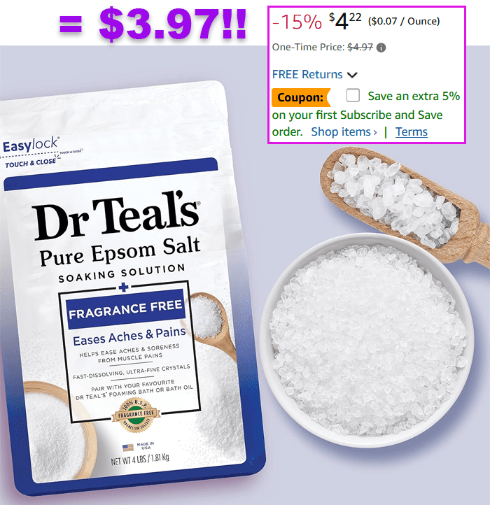 Dr Teal’s Epsom Salt Magnesium Soak, Fragrance-Free, 4 lbs for $4.97