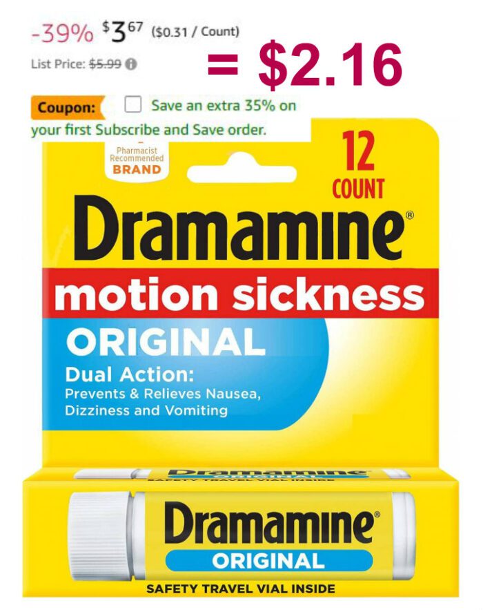 Dramamine Original, Motion Sickness Relief, Travel Vial, 12 Count $2.16 or $2.59
