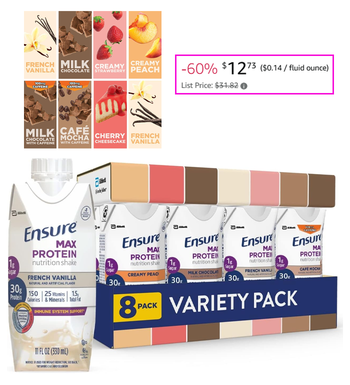 Ensure Max Protein Nutrition Shakes, Variety Pack of 8 for $14.98 (Reg $31.82)