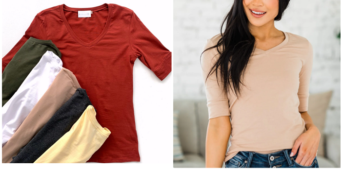 This looks like the perfect tee with a v-neck, longer length, and elbow-length sleeves! This versatile top will go with jeans and skirts, so grab a couple of different colors!