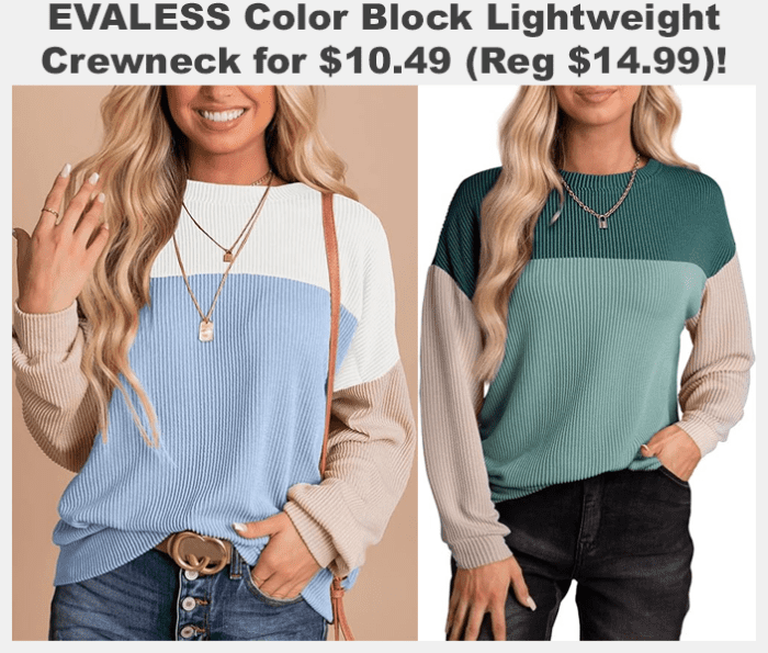 EVALESS Color Block Lightweight Crewneck for $14.99