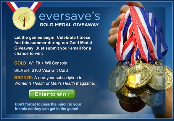 With the Olympics starting tonight, we will be seeing a lot of Olympic-style giveaways and freebies. I love it! Eversave is giving away a Wii Fit and Wii Console, a $100 Visa Gift Card, and a one-year subscription to Women’s Health or Men’s Health. Entering is quick and easy, just go to Eversave and enter your email address and city! That’s it!