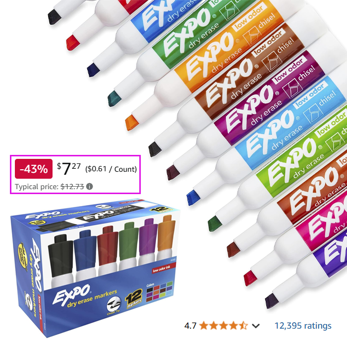 EXPO Low Odor Dry Erase Markers, Chisel Tip, Assorted Colors, 12 Count for $8.08 (Reg $12.73)