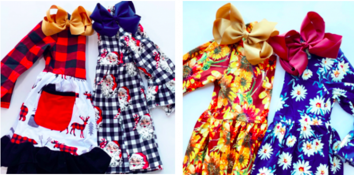 These darling boutique dresses are the perfect outfits. There are 16 different styles to choose from! Each clothing item comes with a free grosgrain bow clip.