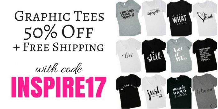 This weekend, you can score a variety of fun Inspirational Graphic Tees for 50% off plus FREE shipping with code INSPIRE17! Prices start at just $9.95!