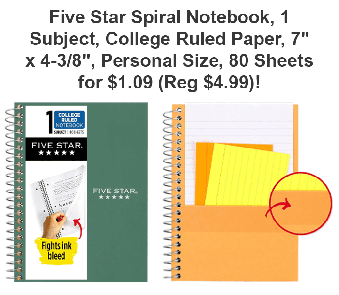 Five Star Spiral Notebook, 1 Subject, College Ruled Paper, 7″ x 4-3/8″, Personal Size, 80 Sheets for $1.09 (Reg $4.99)!