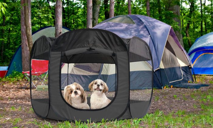 What a great idea for camping with pets! When fully assembled, this playpen keeps pets corralled while giving them a clear, 360° view through its mesh windows. The zippered top can be removed for more airflow, and the pen’s entrance can be untied to let pets in and out.