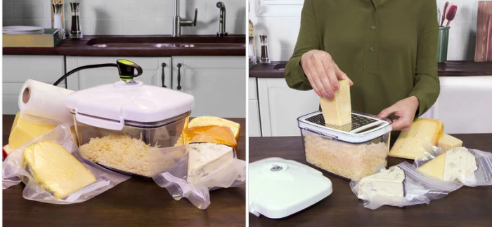 The FoodSaver® Rectangular Canister keeps foods fresh longer in the refrigerator and pantry. Microwave-safe materials make reheating fast and convenient. This comes in 2-quart size with a bonus cheese grater that fits on top of the canister for easy grating and vacuum storage all in one. Vacuum package and preserve cheese and other foods up to 5x longer than average containers – or marinate meat, fish and vegetables in minutes. A low-profile design saves fridge space and our latch design secures a tight seal every time.