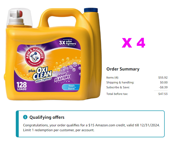 - Pay $47.53 or $53.12, plus get a $15 Amazon credit, which is like paying $32.53 for 4!
