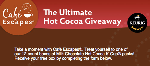 Cafe Escapes is giving away free 12-count boxes of Milk Chocolate Hot Cocoa K-Cup packs! Just head on over to the Green Mountain Facebook page, “like” them, then click on the Cafe Escapes Giveaway tab to score a FREE 12-count box! Hurry, this one should go fast!