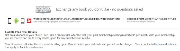 After your 30 day trial, your membership will automatically renew each month for just $14.95, billed to the credit card you used when you registered with Audible. With your membership, you will receive one credit per month plus members-only discounts on all audio purchases. If you cancel your membership before your free trial period is up, you will not be charged.