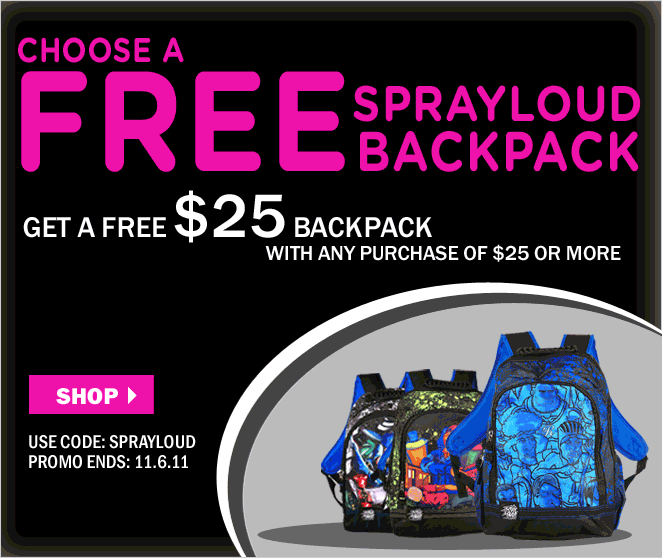 Cookies kids is running this promo until November 6th. When you purchase $25.00 or more you will get a backpack ($25. value) for FREE! Just use coupon code SPRAYLOUD at checkout.