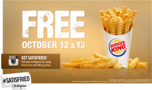 Hooray! This Saturday or Sunday stop in at Burger King to pick up FREE Fries! These are their lower calorie, lower fat Satisfries. No coupon or purchase necessary. Limit 1 per customer.