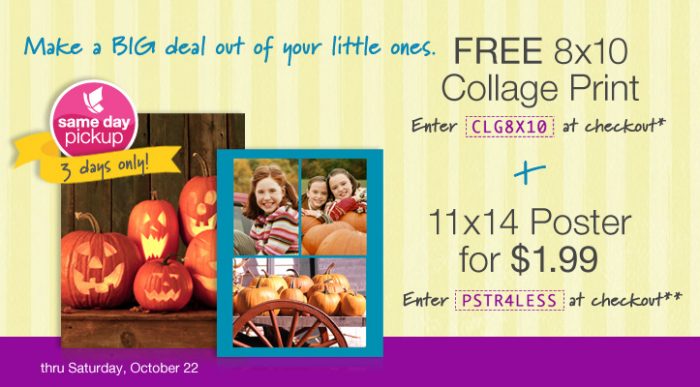 Right now through Saturday, Oct 22nd Walgreens is offering a FREE 8×10 Collage Print! This is an awesome way to get photos printed!  Just go to Walgreens, order your Collage Print and then enter the code CLG8X10 at checkout and it will be FREE.  Make sure to pick it up in the store so you don’t have to pay any shipping!!