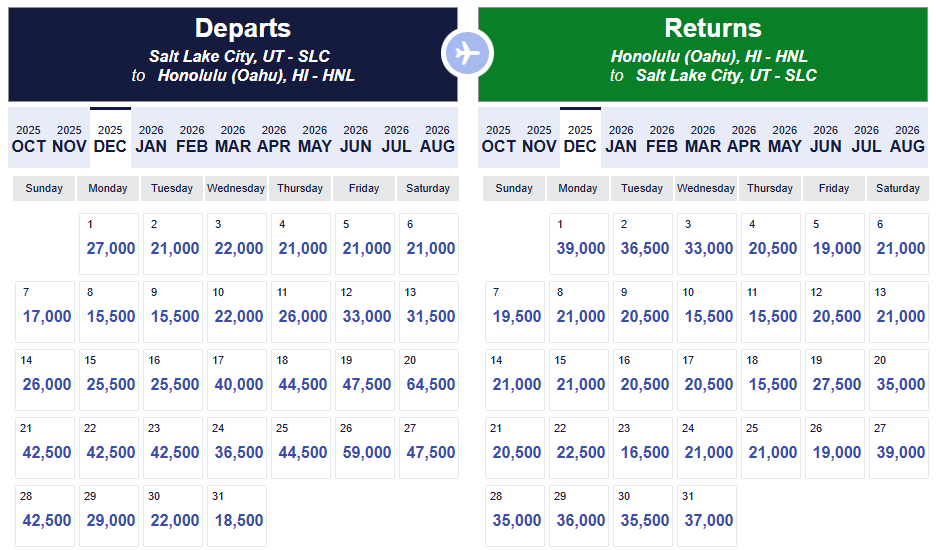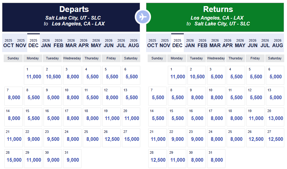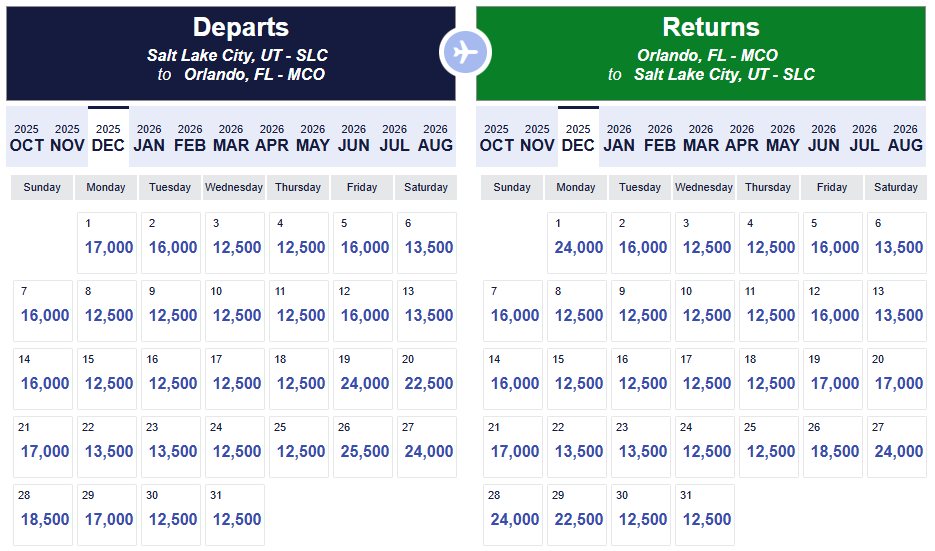 Here’s a quick example of what your points might be able to get you. I just quickly pulled up their Low Fare Calendar for Salt Lake City to Orlando for September 2025. These are points for flights on those days. Roughly, you can see that you can get flights for around 12,500 points each way. That’s over 3 roundtrip flights for FREE!