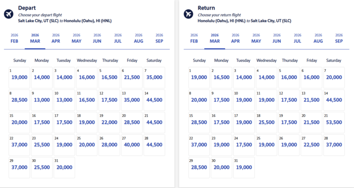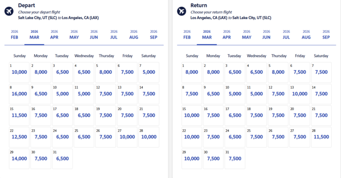 Here’s a quick example of what your points might be able to get you. I just quickly pulled up their Low Fare Calendar for Salt Lake City to Orlando for March 2026. These are points for flights on those days. Roughly, you can see that you can get flights for around 16,000 points each way.