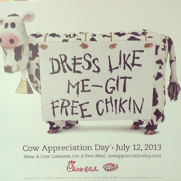 We had dinner out tonight and I snapped this picture with my phone! Yep! Tomorrow is Cow Appreciation Day! What does that mean? Free meals at Chick-fil-A! Just dress up like a cow and head on over to your favorite Chick-fil-A Restaurant!