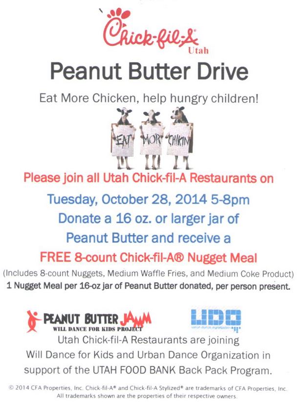On October 28 (that is this upcoming Tuesday) from 5-8 pm, you can get a FREE 8-count Chick-fil-A Nugget Meal at any Utah Chick-Fil-A restaurant just for bringing in a 16-oz jar of peanut butter to be donated to the Utah Food Bank. That’s pretty darn awesome! This isn’t just 8 nuggets, either. You’ll get the whole shabang…medium waffle fries and a medium coke, too!