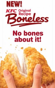 Today if you are one of the first 100 guests to go into your KFC and say, “I ate the bones” you will get a FREE piece of Original Recipe Boneless Chicken! Offer valid from 2-4 pm.