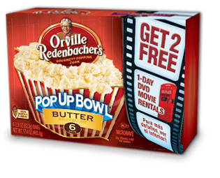 Get FREE* 1-day DVD rentals inside specially-marked packages of Orville Redenbacher’s® Gourmet® Popping Corn. Choose from Movie Theater Butter, Ultimate Butter and Smart Pop varieties. You’ll get one FREE rental inside 3-packs and two FREE rentals inside 6-packs. Hurry before they’re gone!