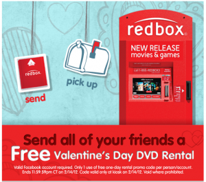 Redbox is offering all of your friends on Facebook a FREE Valentine’s Day DVD rental.  Just send your friends a Valentine from their Facebook page and they’ll get a code for a FREE DVD rental on 2/14/12.  You’ll get one too!