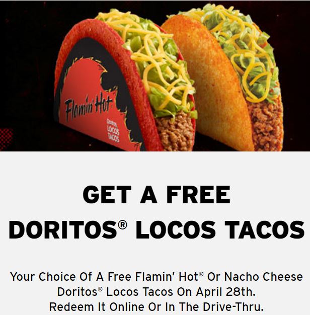 NO PURCHASE NECESSARY. Offer valid on Tuesday 4/28/2020 only during local store operating hours. Limit one (1) Free Seasoned Beef Doritos® Locos Tacos per person, available at participating U.S. Taco Bell® locations only for drive-thru orders or order ahead through the Taco Bell website or app for drive-thru pickup orders, while supplies last. Check local store for availability and hours of operation. Not available with a delivery order. Offer excludes Doritos® Locos Tacos Supreme®. Not valid with any other offer. No substitutions. No cash value. Void where prohibited. DORITOS®, DORITOS® Logo and FLAMIN’ HOT® are trademarks owned by Frito-Lay North America, Inc. © 2020 Taco Bell IP Holder, LLC.