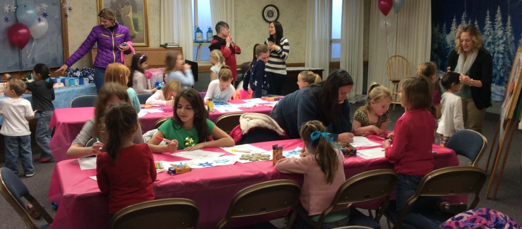 To set the theme of the party, I used the colors turquoise (from Elsa’s dress) and magenta (from Anna’s cape). I found most of my supplies at Watkins Party Store and Dollar Tree in Logan. Decorations were kept simple, since we were holding the party at a church and would need the take down and clean up to be easy. We used