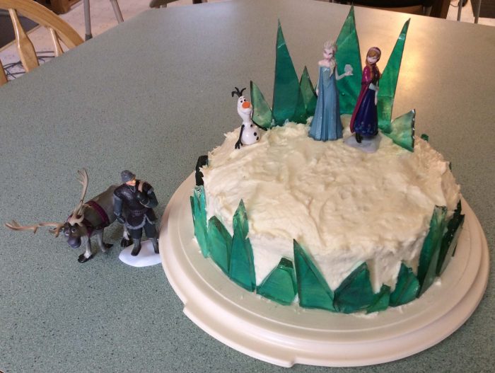 My fabulous husband also decorated the cake, which was made from a Pillsbury Blue Raspberry Cake Mix. We used this creative glass candy idea, also found on Pinterest. Make sure you read the comments in her post about making the glass candy. It took us two times to get it right. The first time we overcooked it and it naturally turned amber, so once the food coloring was added our “glass” was quite green. I also recommend using parchment paper instead of oil on the pan. The candy came out MUCH easier on the parchment paper than the greased pan alone. The movie characters from this Disney Frozen Exclusive 6-Piece PVC Figure Play Set (right now about $32 on Amazon) for the top. Even with the figures on top of the cake (which are played with daily), the total for this cake was less than we would have spent purchasing a cake from the grocery store.