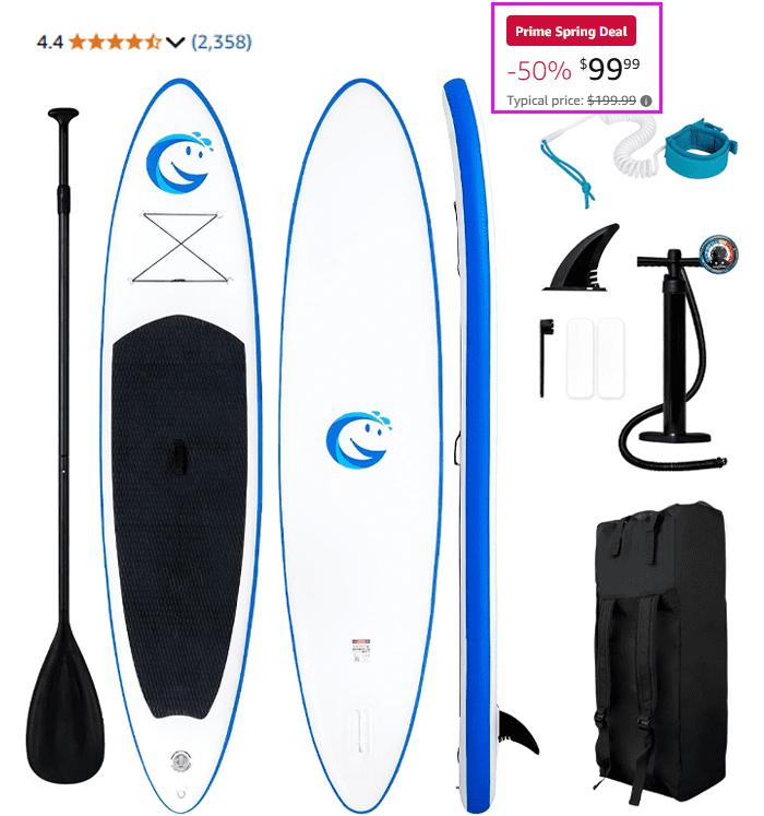 If you need more than one paddle board, this is a great option! No codes are needed, so you can get up to 5 at this price! Hurry, it says there are only 11 left in stock. It also has a high weight limit of 350 pounds and says its length can accommodate 2 people.
