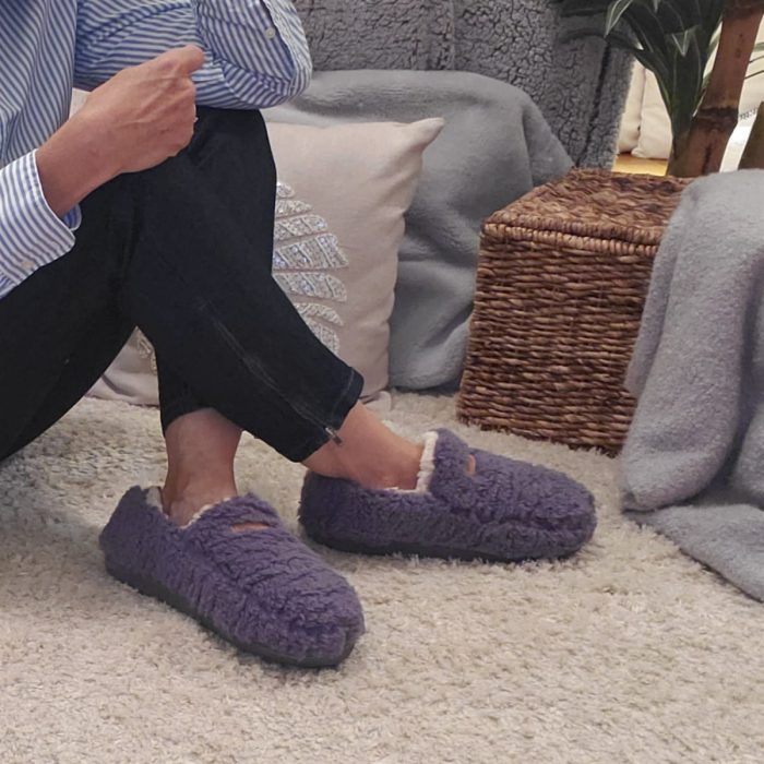 Classic mocassin style with a luxurious Berber upper and super soft faux shearling lining keeps your feet warm.