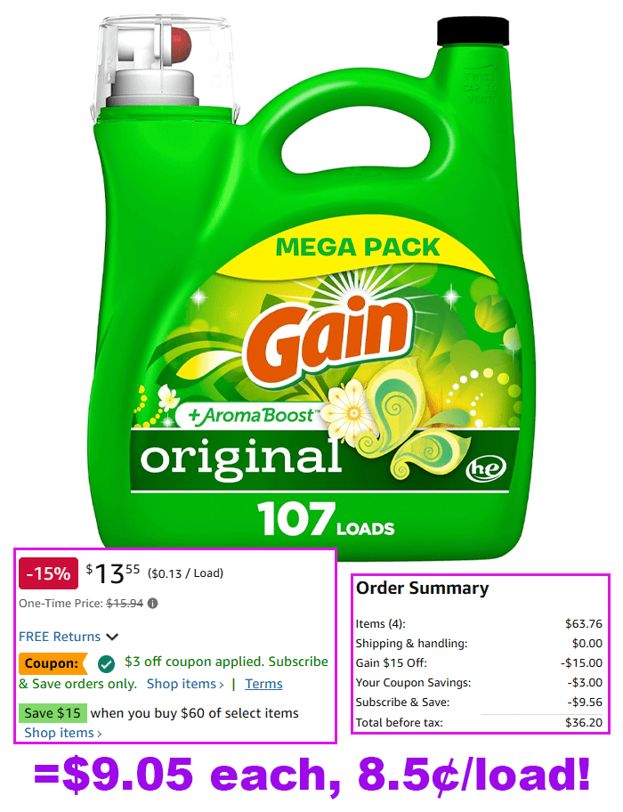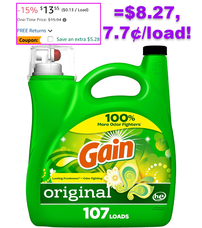 Gain + Aroma Boost Laundry Detergent Liquid, Original Scent, 107 Loads, 154 fl oz, HE Compatible for $15.94