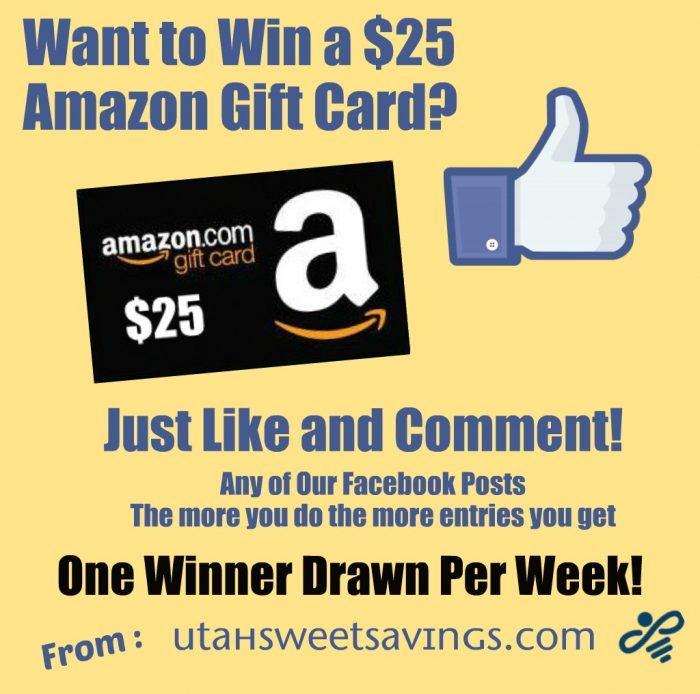 We are giving away a $25 Amazon Gift Card a week over on Our Facebook Page and Facebook Group! And it is SO EASY to enter! All you have to do is like, comment, and share our status updates. This means when you see a post (deal) that you like let us know. Hit that Thumbs Up button! Comment and tell us that you like it! And if you really like it SHARE!!! Every time you do this you will get an entry. There are NO LIMITS to how many times you can enter. Each Like, Comment, and Share will be worth one entry.