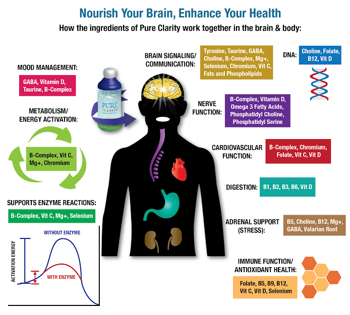 - Each dose of Pure Clarity products includes 100% of the recommended daily allowance of a number of brain-enhancing vitamins and minerals