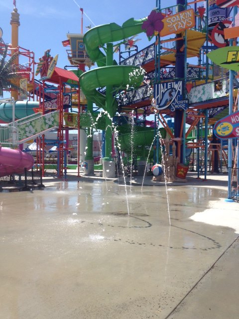At a traditional water park, your entertainment comes also with huge crowds and lines so long that once it’s time to get on a ride again, you have forgotten what it feels like to be wet! No so at Cowabunga Bay! As you make your ascent up either of two stairs that converge and take you every which-a-way to get you to the water slide that you wish to encounter; up above your head, water is raining…sometimes gushing down on you. Sometimes it’s the perfect timing of a bucket above your head that fills to the point of dumping on you, just at the right time as you walk under it. Other times, it’s those waiting in lines above you squirting water from hoses, water guns, or shooting water from perforations in pipes that are controlled by valves that you control manually. As you wait in line, you watch as two GIANT buckets above at the very top of the play structure fill to their limits and with the ringing of a fire alarm bell, warning comes to those on the ground below of the inevitable tidal wave of water that would douse even the fiercest of fires, let alone the parks patrons…but you don’t want to run from this wave, you want to run TO IT…and feel of the gushing water on your head and shoulders. It goes without saying, if you are on the giant play structure, you are WET!