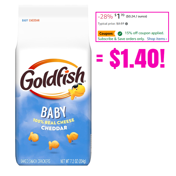 Goldfish Baby Cheddar Cheese Crackers, 7.2 Oz Bag for $2.00 (Reg $2.37)